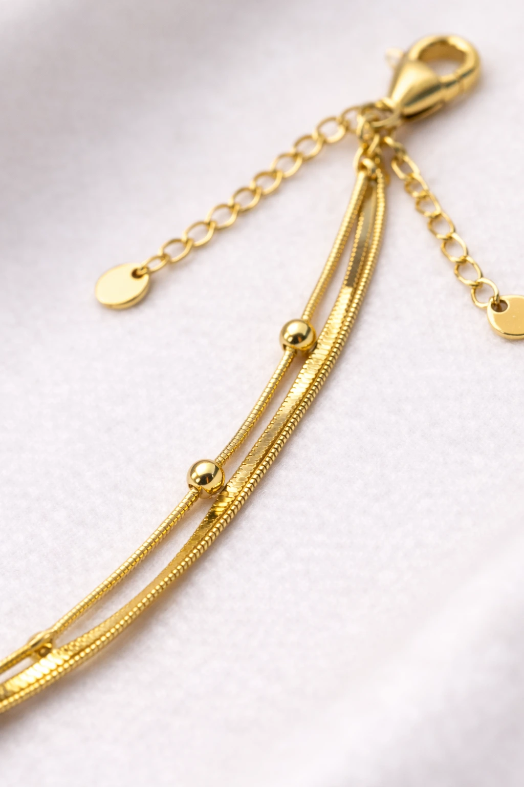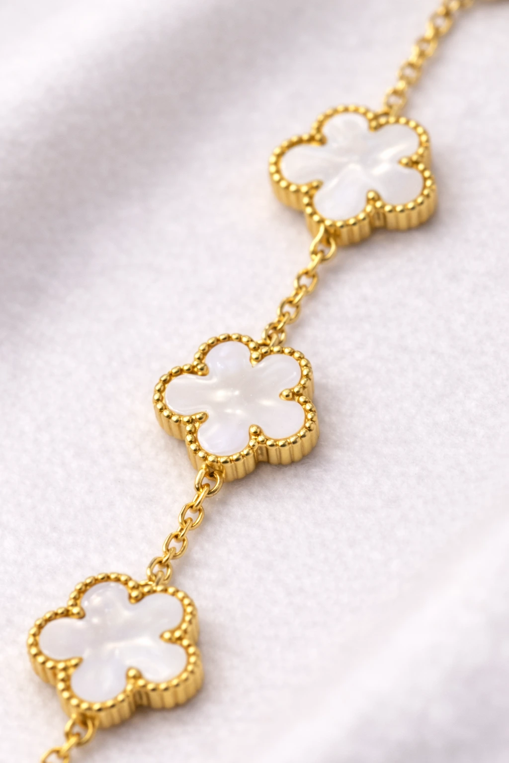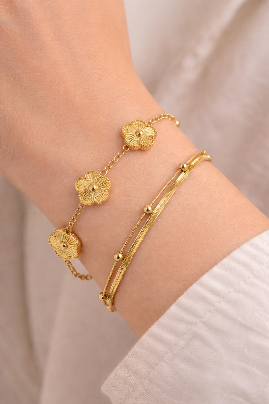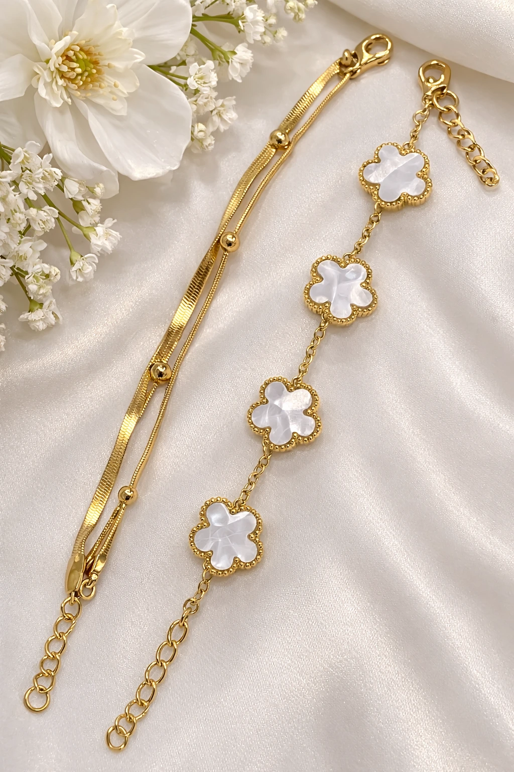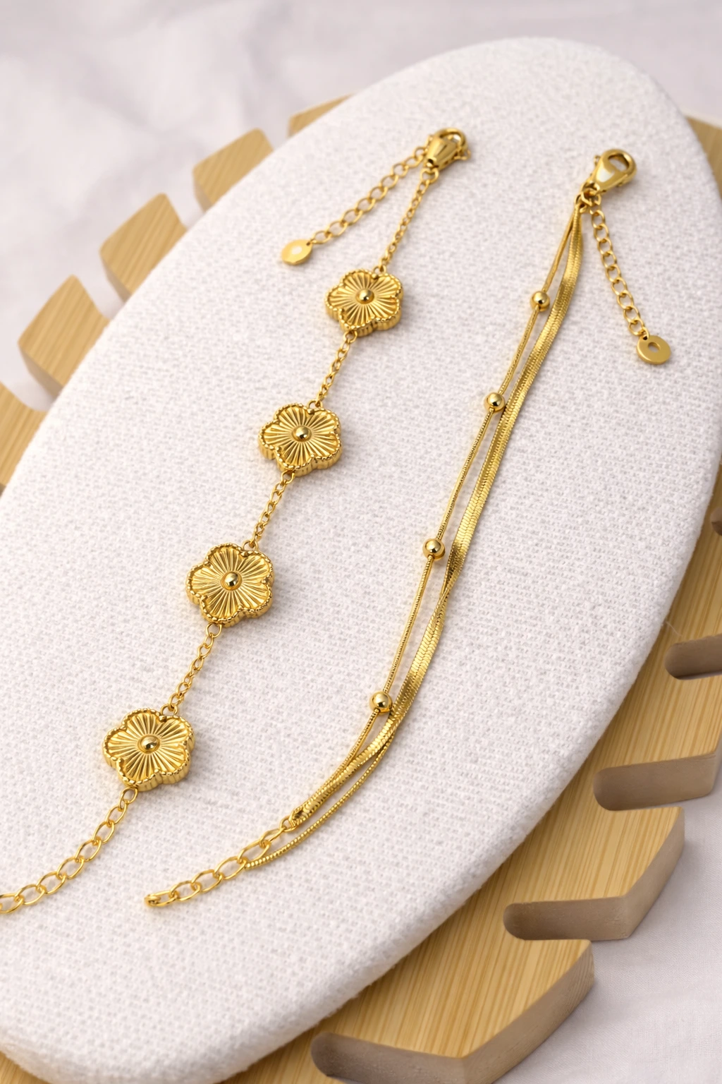 Crafted from premium stainless steel, each bracelet is designed to resist rust, tarnish, and fading while maintaining its radiant gold finish over time. One piece features luminous clover accents that add a soft, graceful touch, while the second bracelet showcases a clean, polished chain with subtle detailing for a refined layered look.