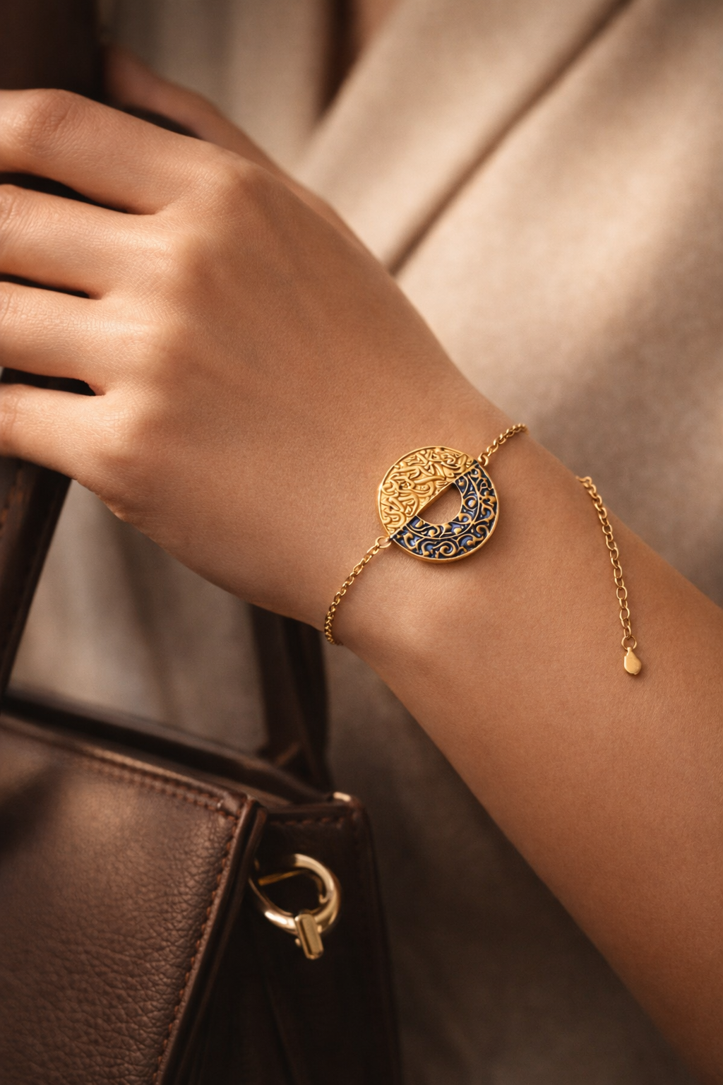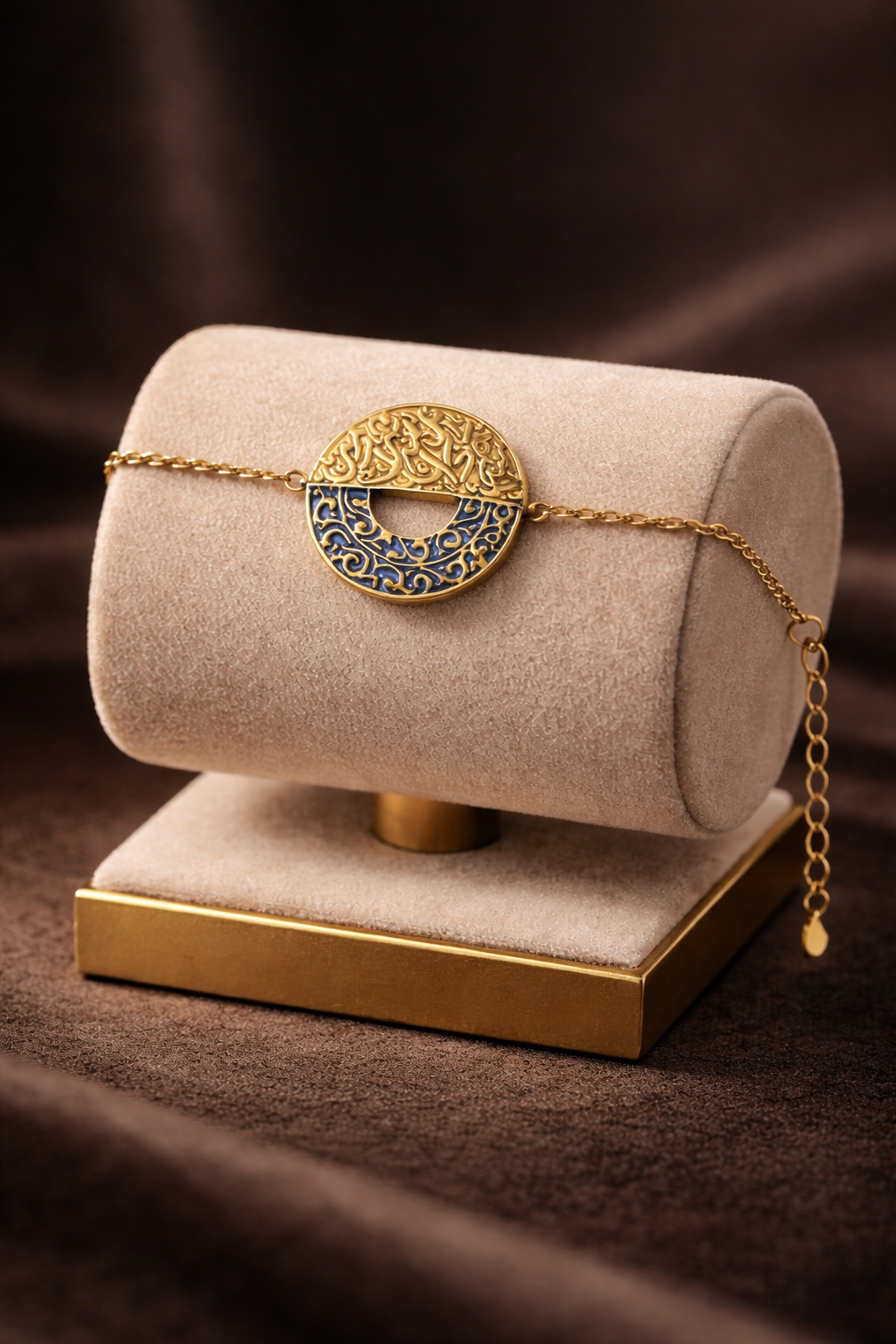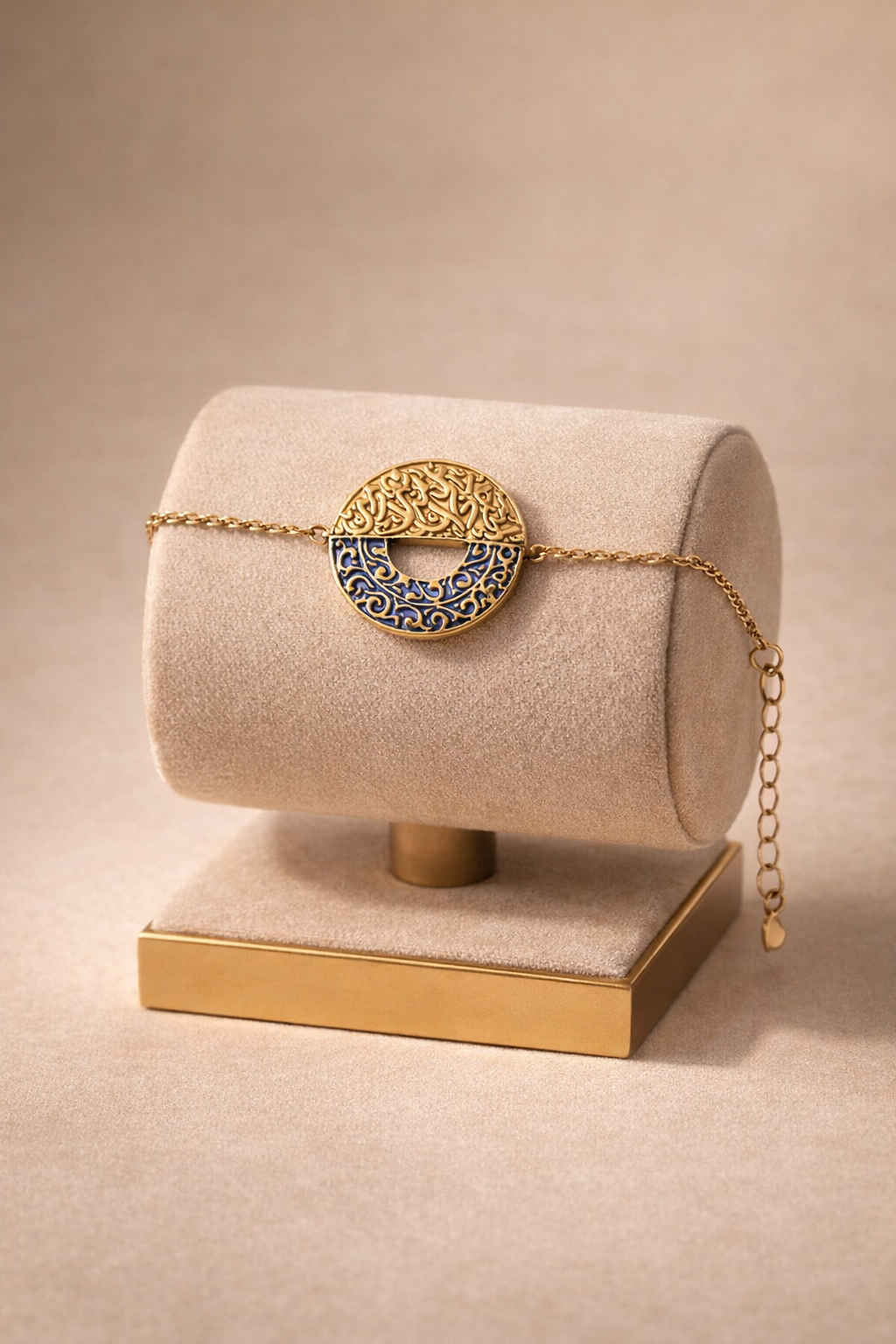A refined expression of art and elegance. The Sapphire Eclipse Bracelet features a circular centerpiece adorned with intricate engraved patterns and deep blue detailing, creating a stunning contrast against its golden finish.