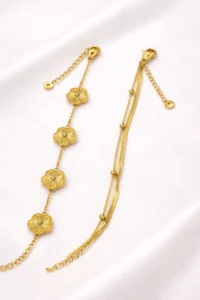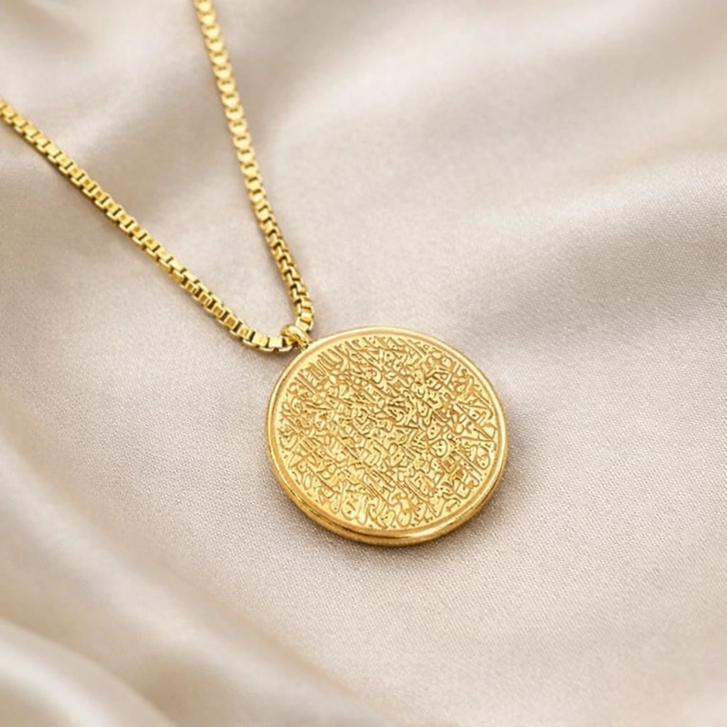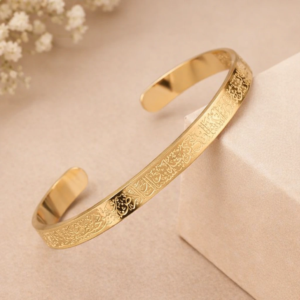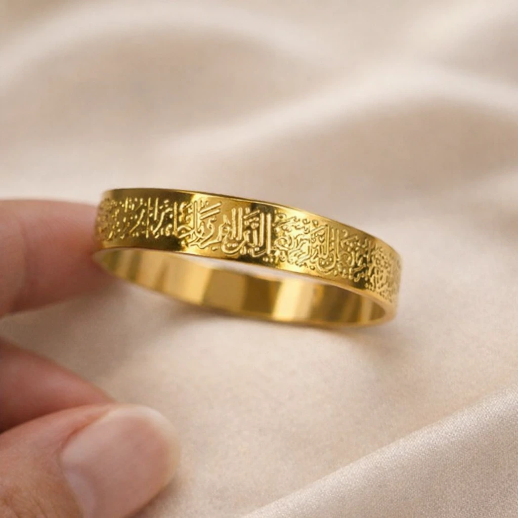 A beautifully crafted stainless steel jewelry set featuring a delicate Ayatul Kursi pendant necklace, matching ring, and elegant bangle — designed with a radiant gold finish for timeless elegance and spiritual significance.